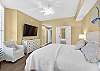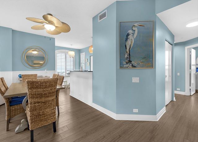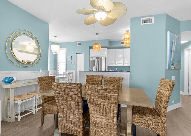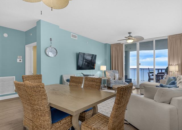 This condo comfortably sleeps up to 8 guests. It is beautifully furnished, all of the amenities of home and more. Beautiful and comfortable living room furniture will make for great evening gatherings. You can enjoy mornings and evenings on one of the most spectacular balconies on Navarre Beach with a full ocean view. This condo has all well furnished bedrooms; 1 king sized bed in the primary ensuite, 1 queen sized bed in the second bedroom and two full size beds in the third ensuite bedroom to accommodate everyone comfortably.